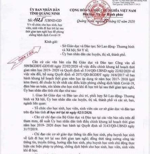 Ngày 26/2, UBND tỉnh Quảng Ninh đã có văn bản hỏa tốc gửi các Sở, ngành có liên quan về việc tổ chức cho HS, SV, học viên các cơ sở Giáo dục & Đào tạo trên địa bàn tỉnh đi học trở lại từ ngày 2/3