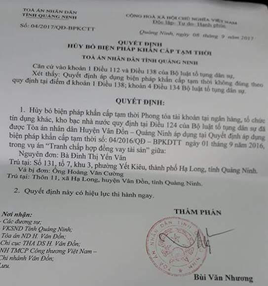 Liên quan đến sự việc, trao đổi với PV Pháp luật Plus, bà Trương Thị Túc, Thẩm phán TAND huyện Vân Đồn cho biết: Trong vụ việc này, chị Đinh Thị Yến Vân đã khởi kiện cá nhân anh Hoàng Văn Cường. Việc Tòa án huyện Vân Đồn ra quyết định áp dụng biện pháp khẩn cấp tạm thời là do bà Yến Vân đã có đơn yêu cầu áp dụng các biện pháp khẩn cấp tạm thời, gồm phong tỏa tài sản của ông Cường và phong tỏa công ty Quan Minh và Tân Lập.