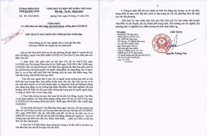 Đồng thời, cũng liên quan đến công tác chỉ đạo phòng chống dịch trong tình hình mới có những diễn biến phức tạp và căng thẳng, trước đó cùng ngày Chủ tịch UBND tỉnh Quảng Ninh vừa có điện, yêu cầu thực hiện giãn cách xã hội đối với huyện Vân Đồn và phong toả tạm thời thị trấn Cái Rồng từ 12h00 ngày 30/1/2021 đến 12h00 ngày 21/2/2021.