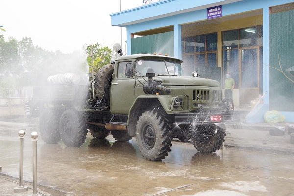 Phun hóa chất khử khuẩn, tiêu độc tại khu vực cách ly tập trung của phường Kim Sơn, TX Đông Triều (nguồn ảnh quân khu 3 online).