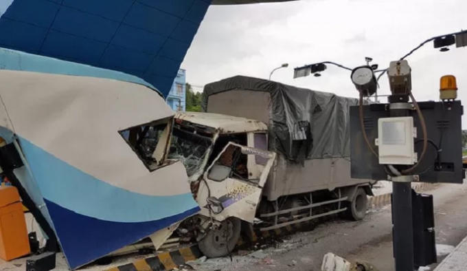 Theo ghi nhận tại hiện trường, chiếc xe tải bị hư hại nặng, lốp văng ra khỏi xe, toàn bộ cabin trạm thu phí bị hư hại hoàn toàn.