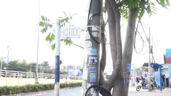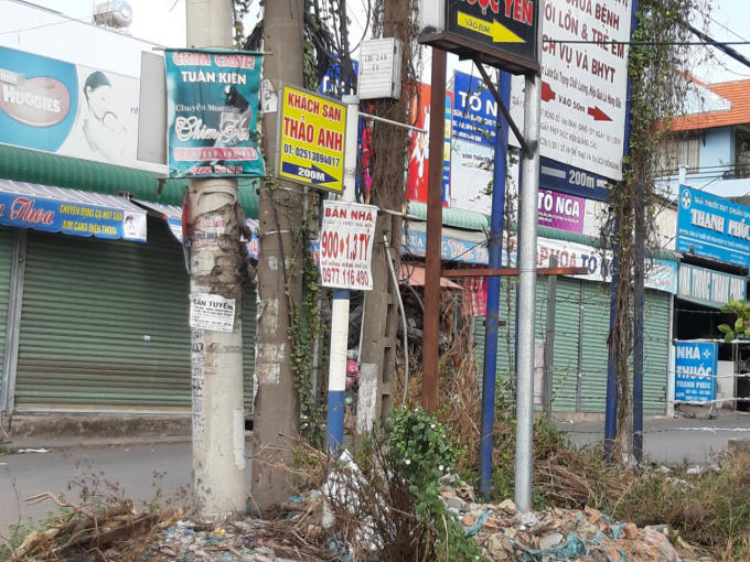 Tại con hẻm ở phường Long Bình, cây cột được người dân tận dụng làm chỗ treo chậu hoa. Hay tại con hẻm ở phường Tân Hiệp, cây cột được chủ một tiệm hớt tóc dùng để gắn bảng quảng cáo. Và hàng chục biển hiệu, pano, biển quảng cáo các loại… được người dân vô tư chiếm dụng vào các mục đích cá nhân.