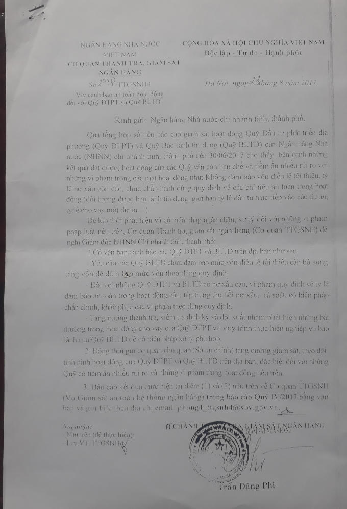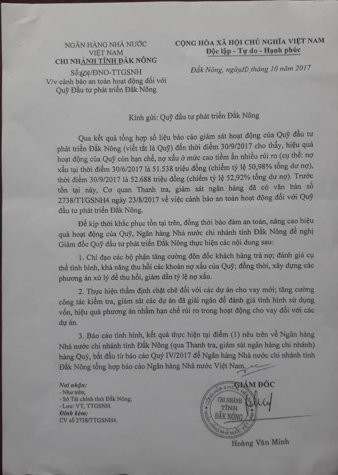 Đến ngày 20/10/2017, chi nhánh Ngân hàng nhà nước tại Đắk Nông cũng có văn bản số 604/ĐNO-TTGSNH về việc cảnh báo an toàn hoạt động đối với Quỹ đầu tư và phát triển Đắk Nông nhưng lãnh đạo tỉnh và Quỹ vẫn chưa có động thái gì?