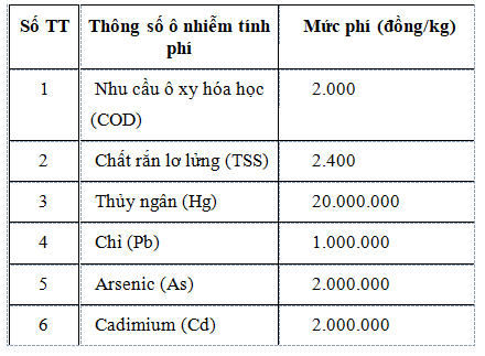 - C là phí biến đổi, tính theo: tổng lượng nước thải ra, hàm lượng thông số ô nhiễm của từng chất có trong nước thải và mức thu đối với mỗi chất theo Biểu dưới đây: