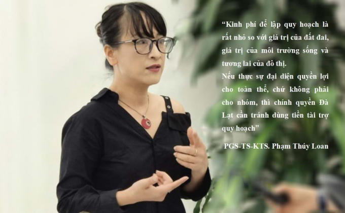 Trong cuộc trao đổi với Người Đô Thị về quy hoạch chi tiết Khu trung tâm Hòa Bình - Đà Lạt, cách ứng xử của chính quyền Lâm Đồng đối với vai trò tài trợ kinh phí lập đồ án quy hoạch của Công ty cổ phần địa ốc Đại Quang Minh, và phương án kiến trúc khu vực đồi Dinh Tỉnh trưởng đang lấy ý kiến, PGS-TS-KTS. Phạm Thúy Loan (Phó viện trưởng Viện Kiến trúc Quốc gia, Bộ Xây dựng; Chủ tịch Hội Bảo tồn di sản hiện đại Việt Nam thuộc mạng lưới Hội bảo tồn di sản hiện đại quốc tế) cho biết, quá trình thực hành chuyên môn bà đã nhìn thấy quy hoạch ở nhiều nơi bị thao túng bởi nhà tài trợ kinh phí lập quy hoạch, và mất đi vai trò “cân bằng, dung hoà” các lợi ích và mâu thuẫn.