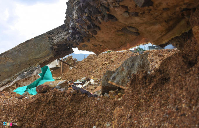 Đặc biệt, sau bão số 5, hàng trăm m2 kè công trình bị đứt gãy, xô lệch, sụt lún, trong đó có nhiều đoạn nền dầm ngang bờ kè này bị sóng đánh gãy đứt.
