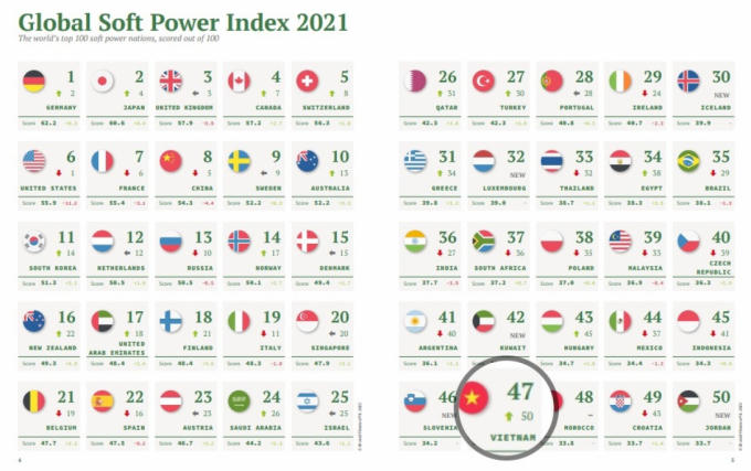 Việt Nam tăng 3 bậc lên vị trí 47 trong bảng xếp hạng “quyền lực mềm” toàn cầu 2021.