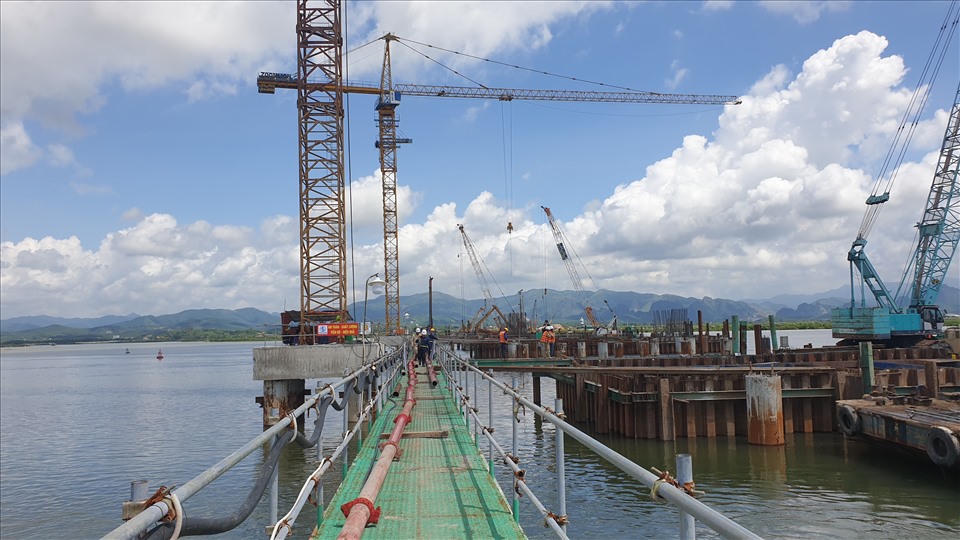 Thi công cầu Cửa Lục 1 bắc qua vịnh Cửa Lục. Ảnh: Nguyễn Hùng