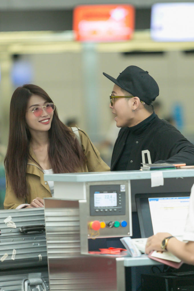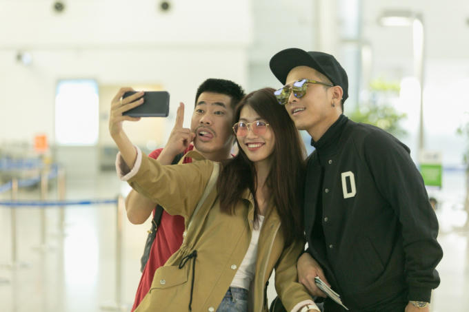 Đồng hành cùng Quỳnh Châu là ca sĩ Mai Tiến Dũng. Vốn quen nhau từ trước, cả hai khá thân thiết và liên tục trò chuyện, hỏi thăm nhau tại sân bay. Quỳnh Châu, Mai Tiến Dũng và stylist Travis Nguyễn cũng tranh thủ selfie trong lúc chờ đợi lên máy bay.
