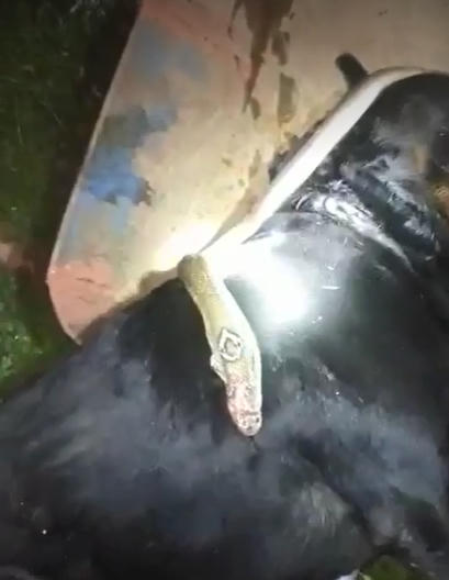 Ít phút sau, con rắn bị chó cắn chết tại chỗ. Con chó cũng bị rắn cắn nên ngấm độc chết sau đó 10 phút.
