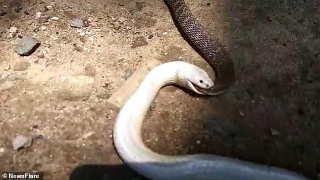 Chỉ vài phút sau, người ta chỉ còn nhìn thấy phần đuôi của con rắn nâu xấu số trong miệng rắn bạch tạng.