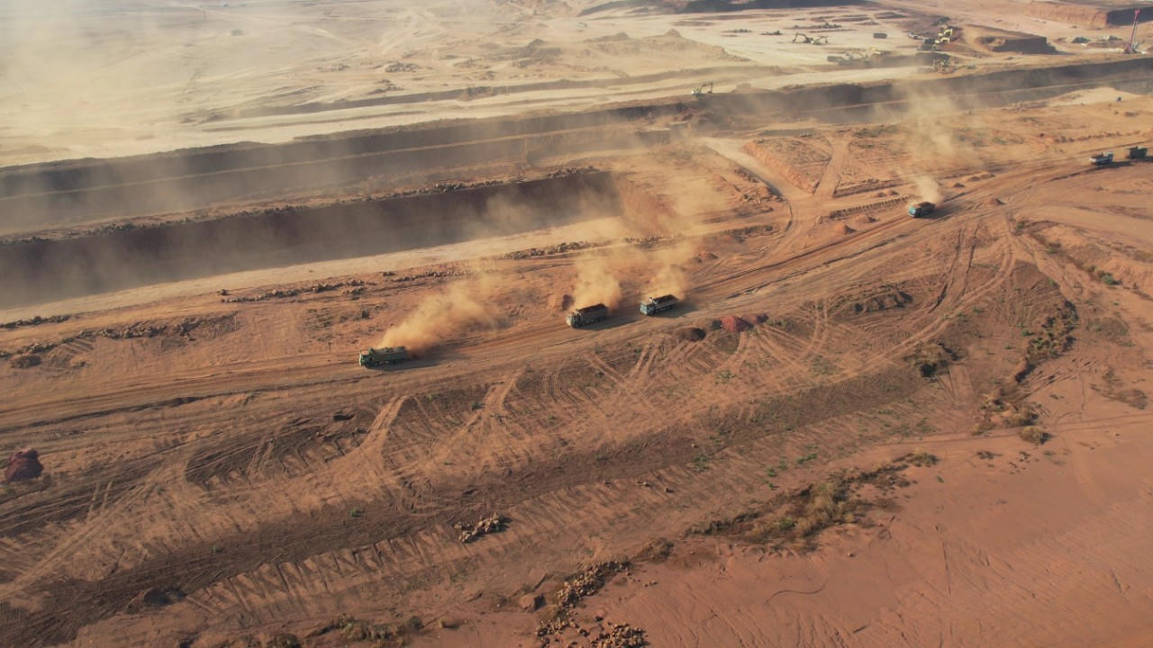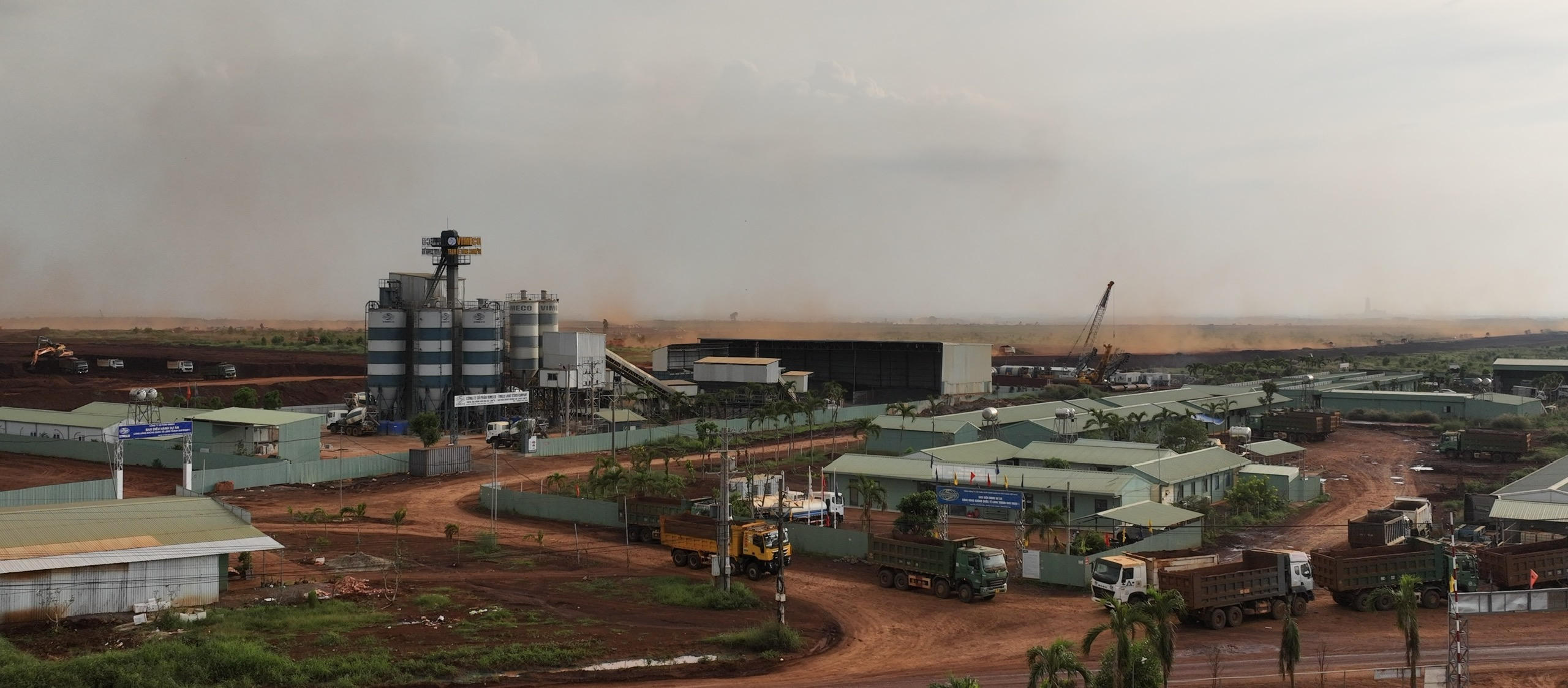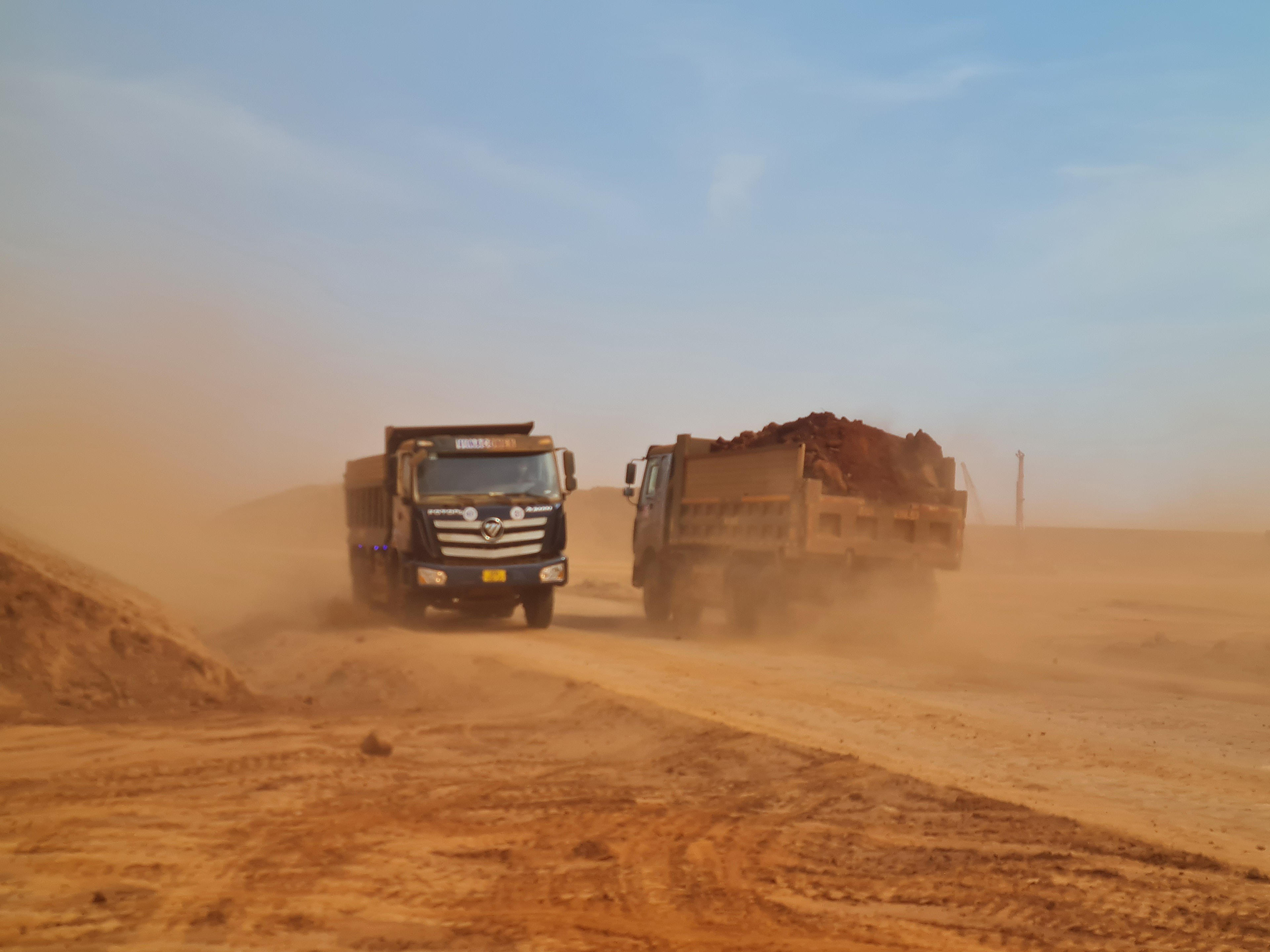 Các xe ben chở đất, đá nguyên vật liệu hối hả hoạt động.