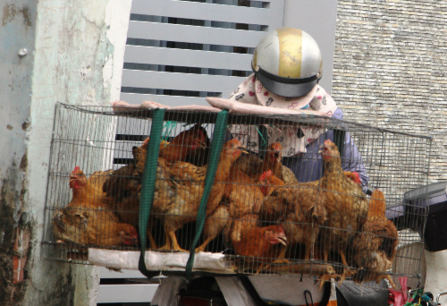 | Gần đây gà sống được rao bán tới tận cổng nhà. Ảnh: Hồng Châu. |