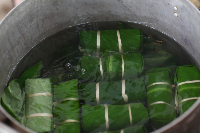 | Các đội tất bật trong phần thi gói bánh chưng |