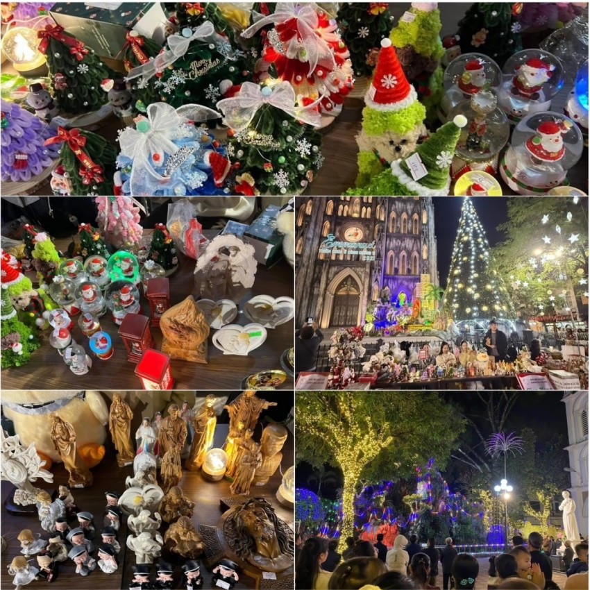 Tại các tuyến phố màu sắc đỏ, xanh, trắng phủ kín các gian hàng trang trí. Cây thông, ông già Noel, tuần lộc, chuông bạc… được bày bán san sát, thu hút đông đảo người dân và du khách.