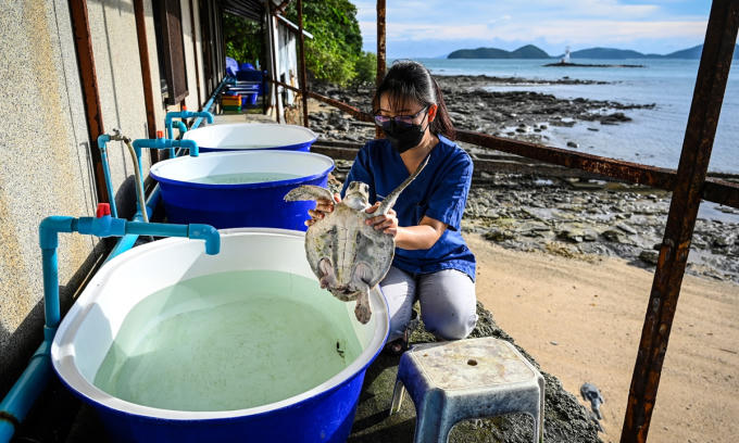 Nhân viên y tế đang chăm sóc một chú rùa tại Trung tâm inh học biển Phuket. Ảnh: AFP