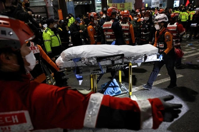 Lực lượng chức năng vận chuyển các nạn nhân tại hiện trường vụ giẫm đạp ở Seoul (Ảnh: Reuters).