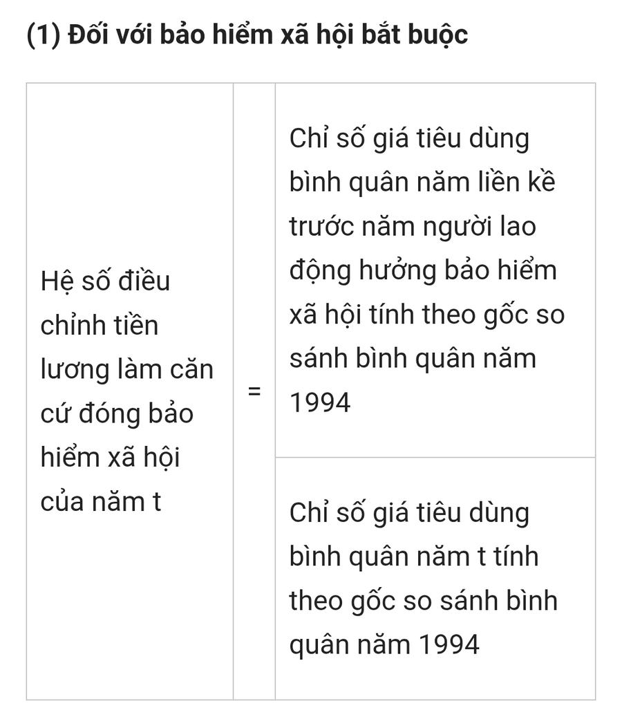 Lưu ý: Hệ số điều chỉnh tiền lương làm căn cứ đóng bảo hiểm xã hội của các năm trước năm 1995 được lấy bằng hệ số điều chỉnh tiền lương làm căn cứ đóng bảo hiểm xã hội của năm 1994.
