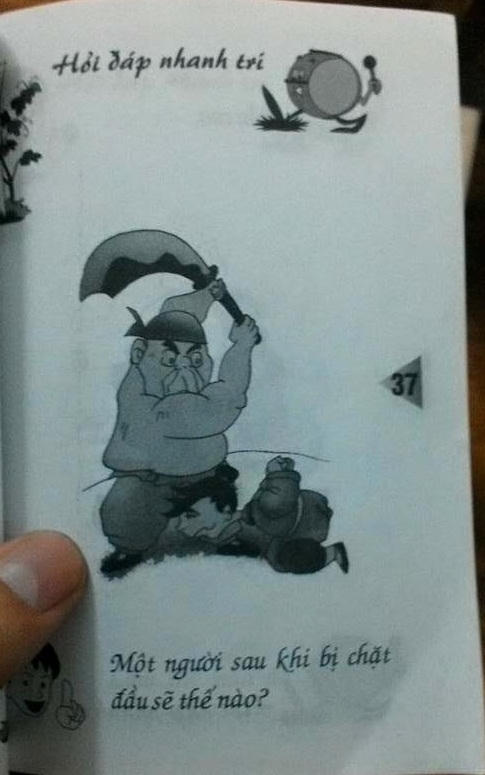 Một cuốn sách khác dành cho trẻ tiếp tục bị phản ảnh vì nội dung chưa phù hợp là cuốn "Hỏi đáp nhanh trí" của Nhà xuất bản Văn hoá Thông tin, có đưa hình ảnh chặt đầu nhiều lần với những câu hỏi rất vô cảm.