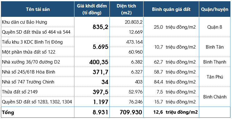 Phần lớn tài sản này là quyền sử dụng đất ở những quận, huyện vùng ven TP HCM. Tổng giá trị khởi điểm ước tính trên 8.930 tỉ đồng