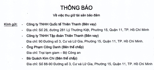 Trung tâm xử lý nợ của Sacombank mới đây đã thực hiện thu giữ hàng loạt tài sản của Công ty TNHH Quốc tế Thiên Thanh, Công ty TNHH Tập đoàn Thiên Thanh, Công ty TNHH MTV Thương mại Dịch vụ Xây dựng Phú Nguyễn… và tài sản của ông Phạm Công Danh, bà Quách Thị Kim Chi.