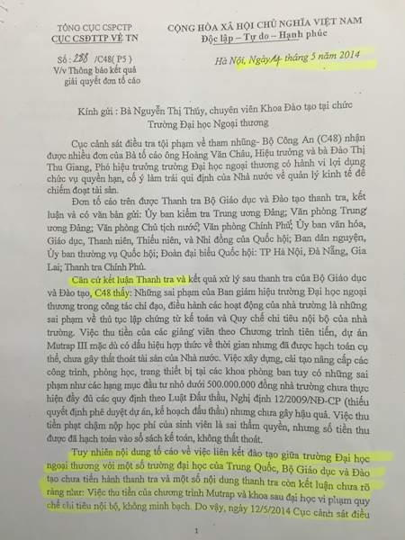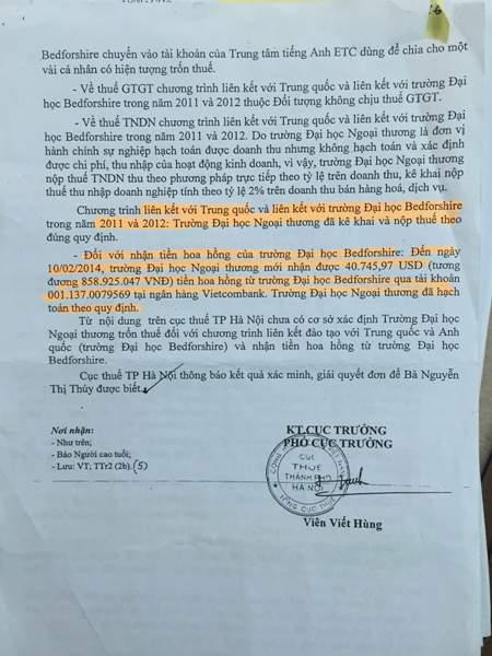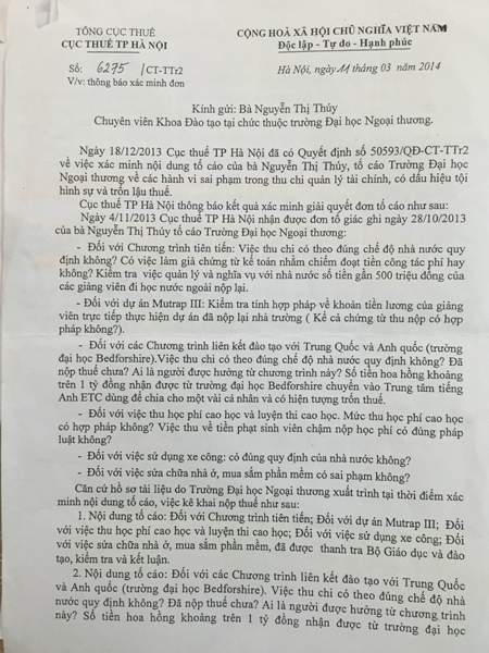 Theo tìm hiểu của phóng viên, ngày 11/3/2014, Cục thuế Thành phố Hà Nội đã có văn bản 6275 thông báo xác minh đơn tố cáo của bà Thúy. Trong văn bản này cho biết: Chương trình liên kết với Trung Quốc trong năm 2011 và 2012 trường ĐH Ngoại thương đã kê khai và nộp thuế theo đúng quy định.