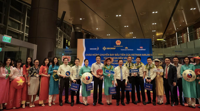 Đây là chuyến bay quốc tế đầu tiên của Vietnam Airlines cũng như của hàng không Việt Nam đến sân bay Vân Đồn.