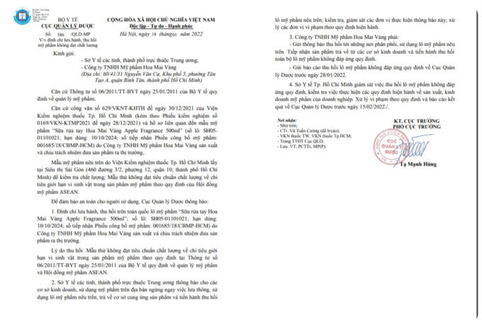 Trước đó, vào ngày 21/1/2022, Cục Quản lý dược - Bộ Y tế đã ban hành Công văn số: 386/QLD-MP ra ngày 18/1/2021 đình chỉ lưu hành, thu hồi mỹ phẩm không đạt tiêu chuẩn chất lượng mỹ phẩm Sữa rửa tay Hoa Mai Vàng Apple Fragrance 500ml, cùng số lô vừa bị thu hồi nêu trên do Công ty TNHH Mỹ phẩm Hoa Mai Vàng sản xuất và chịu trách nhiệm đưa sản phẩm mỹ phẩm ra thị trường.