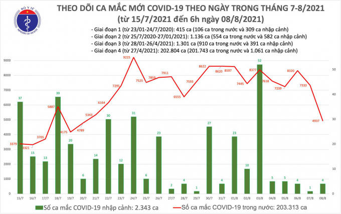 Tính từ 18h30 ngày 7/8 đến 6h ngày 8/8 trên Hệ thống Quốc gia quản lý ca bệnh COVID-19 ghi nhận 4.941 ca nhiễm mới, trong đó 04 ca nhập cảnh và 4.937 ca ghi nhận trong nước.