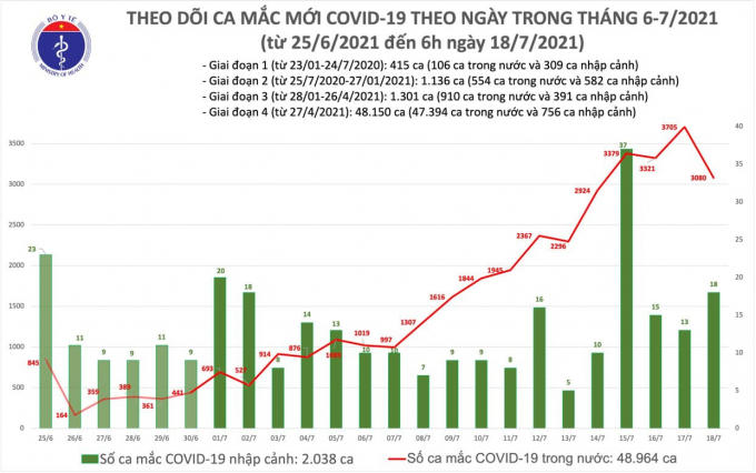 Tính đến 6h ngày 18/7: Việt Nam có tổng cộng 48.964 ca ghi nhận trong nước và 2.038 ca nhập cảnh.