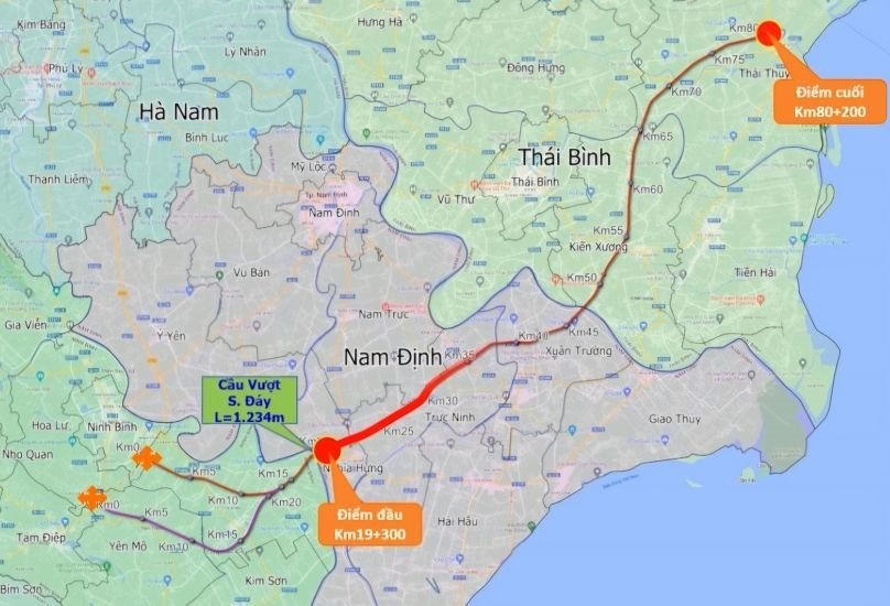 Điểm đầu dự án tại Km19+300 tại đầu cầu vượt sông Đáy phía Nam Định, thuộc địa bàn xã Nghĩa Thái (huyện Nghĩa Hưng, tỉnh Nam Định); điểm cuối tại khoảng Km80+200 tại nút giao giữa quốc lộ 37 và đường ven biển, thuộc địa bàn xã Thụy Trình (huyện Thái Thụy, tỉnh Thái Bình).