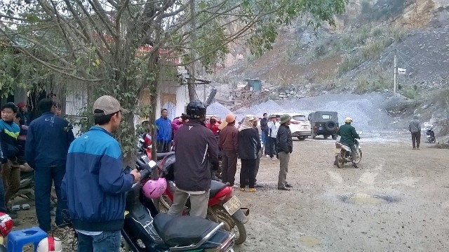 | Rất đông người dân tập trung gần khu mỏ đá. Lực lượng cứu hộ vẫn nỗ lực tìm kiếm nạn nhân mất tích |