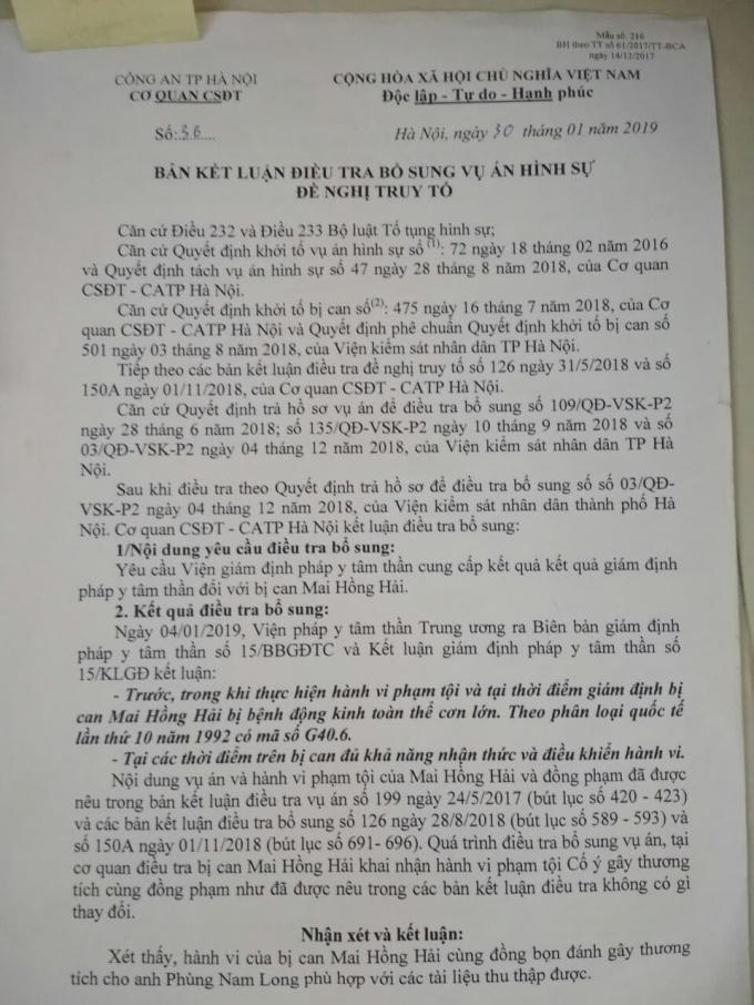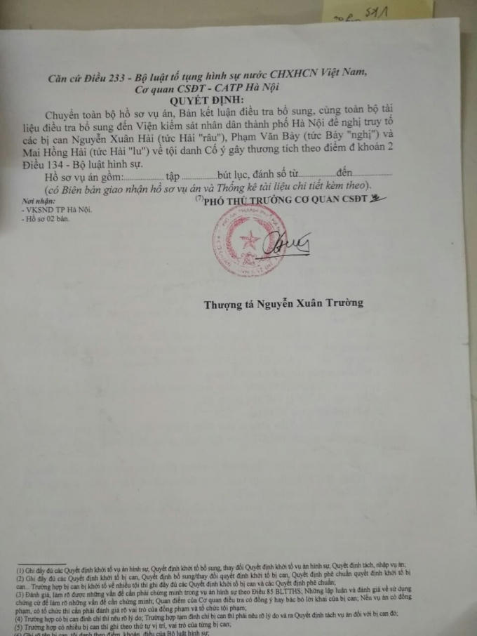 Căn cứ vào Kết luận điều tra bổ sung số 36 ngày 30-1-2019 của CQCSĐT CATP Hà Nội, VKSND huyện Quốc Oai đã truy tố bị can Hải “râu” và Hải “lu” phạm tội “Cố ý gây thương tích” thuộc trường hợp có tính chất côn đồ, còn Bảy “nghị” cũng phạm tội trên nhưng thuộc trường hợp có tính chất côn đồ và tái phạm nguy hiểm. Còn đối với tội “Huỷ hoại tài sản” và “Gây rối trật tự công cộng”, do chưa làm rõ được đối tượng phạm tội nên ngày 22-5-2017, CQCSĐT CATP Hà Nội đã ra quyết định tách vụ án và tạm đình chỉ điều tra đối với hành vi phạm hai tội trên để tiếp tục điều tra, khi nào rõ xử lý sau.