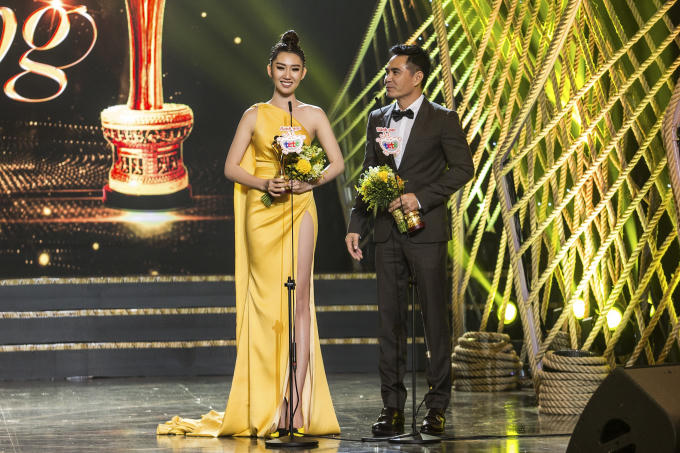 Tối 12/1, lễ trao giải 'Mai Vàng' diễn ra tại TP HCM. Diễn viên Thúy Ngân diện trang phục màu vàng rực rỡ, tôn nước da trắng ngần. Bộ váy có những chi tiết cắt xẻ táo báo giúp cô khoe khéo lợi thế hình thể. Trên thảm đỏ, cô tình tứ khoác tay đàn anh - diễn viên Trung Dũng và rạng rỡ chụp hình kỷ niệm.