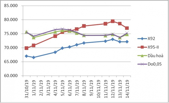 Đối bình quân giá thành phẩm xăng dầu thế giới trong 15 ngày trước kỳ điều hành giá xăng dầu ngày 15/11/2019 có biến động tăng giảm đan xen và có sự khác nhau giữa các loại xăng dầu, giá các loại xăng xu hướng chung là tăng nhưng các loại dầu có xu hướng chung giảm.