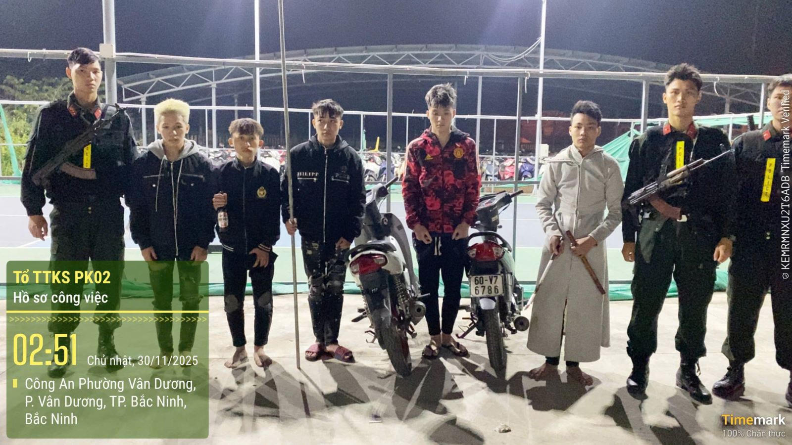 Khoảng 01h15', ngày 12/12/2025, Tổ công tác Phòng Cảnh sát cơ động trong lúc làm nhiệm vụ tại phường Nam Sơn, tỉnh Bắc Ninh phát hiện hai nam thanh niên có biểu hiện nghi vấn. Tiến hành kiểm tra, tổ công tác thu giữ tại hiện trường một số dụng cụ để cạy phá như tua vít, kìm cắt sắt, đèn pin, xẻng, dao rọc giấy, một xà cầy cùng một xe máy hiệu Dream.