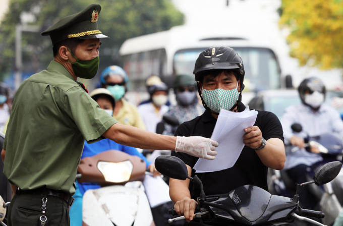 Công an kiểm tra giấy đi đường của người dân trên đường (Ảnh: Ngọc Thành/Vnexpress)