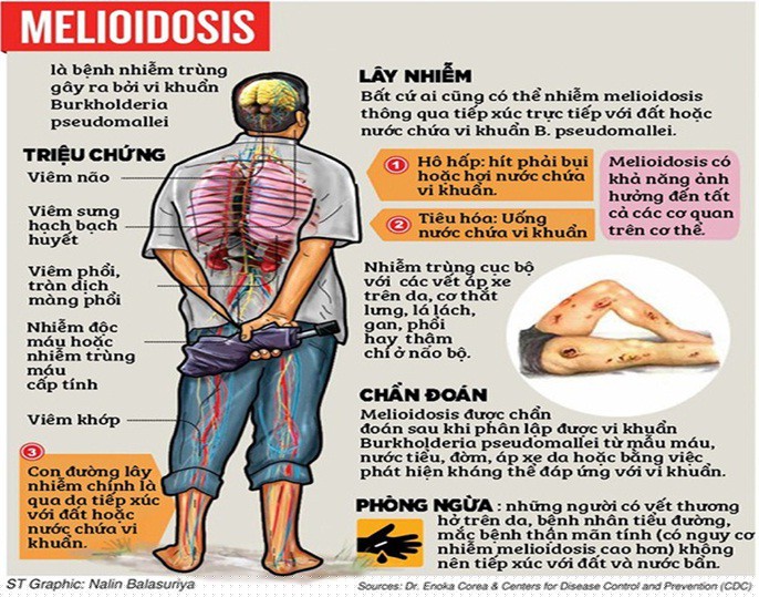 Bác sĩ Nguyễn Thị Mai Huyền, Phó trưởng khoa Bệnh Nhiệt đới (Bệnh viện Trung ương Thái Nguyên) cho biết, bệnh Whitmore (hay Melioidosis) là một bệnh lây nhiễm gây ra bởi vi khuẩn gram âm B.Pseudomallei thường được tìm thấy trong nước bẩn, đất, lây lan sang người và động vật qua tiếp xúc trực tiếp với nguồn ô nhiễm (như hít phải bụi nhiễm vi khuẩn hay khi tiếp xúc với đất bị ô nhiễm qua các vết trầy xước ngoài da).