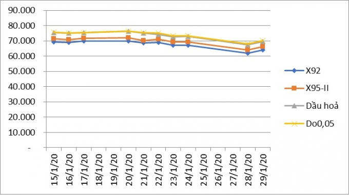 Đối với bình quân giá thành phẩm xăng dầu thế giới trong 15 ngày trước kỳ điều hành giá xăng dầu ngày 30/01/2020 có biến động tăng giảm đan xen nhưng xu hướng chung là giảm.