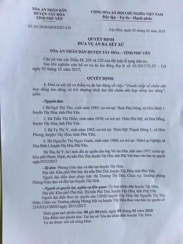 Theo quyết định, ngày xét xử gồm 2 ngày là ngày 1 và ngày 2/2/2018. Nguyên đơn là 12 giáo viên (GV); bị đơn là Phòng GD&ĐT huyện Tây Hòa; người có nghĩa vụ liên quan là UBND huyện Tây Hòa. Lý do khởi kiện vì phòng GD&ĐT huyện Tây Hòa đã cho thôi việc trái pháp luật.
