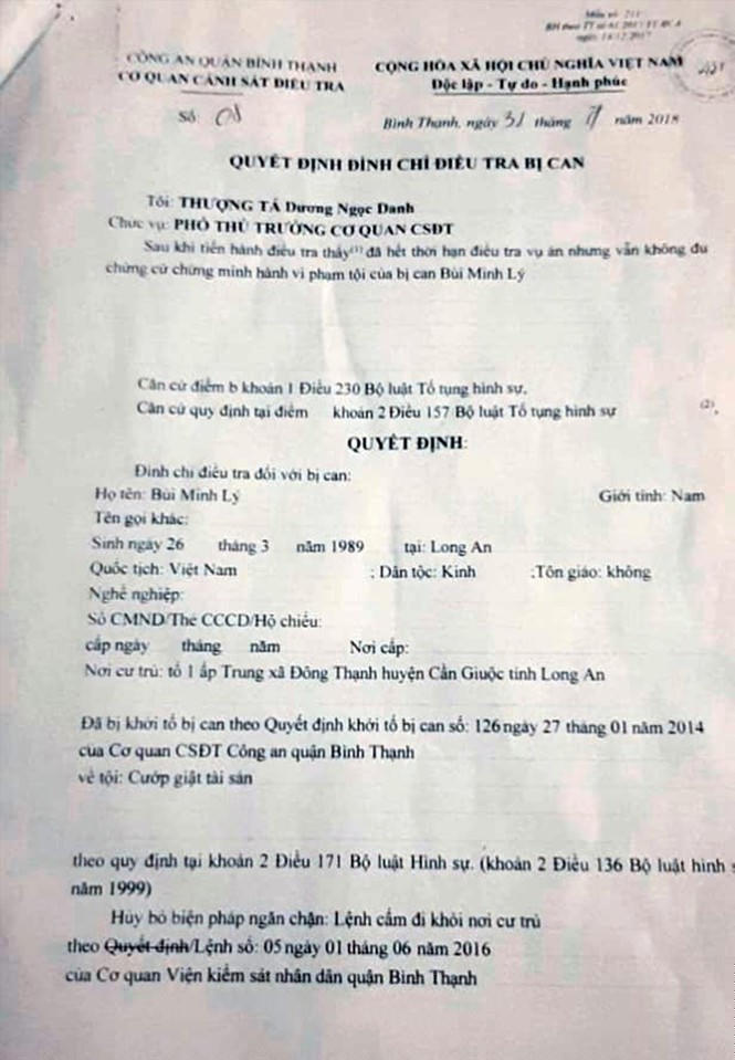 Tháng 6/2016, Viện KSND quận Bình Thạnh hay đổi biện pháp ngăn chặn, cho anh Lý tại ngoại sau hơn 28 tháng bắt tạm giam. Sau gần 3 năm điều tra lại, Cơ quan CSĐT Công an quận Bình Thạnh quyết định đình chỉ điều tra bị can đối với anh Lý. Theo Quyết định đình chỉ bị can số 08 của Cơ quan CSĐT Công an quận Bình Thạnh, sau khi tiến hành điều tra lại vụ án, vẫn không đủ chứng cứ chứng minh anh Lý có tội nên Cơ quan điều tra đình chỉ theo khoản 2 Điều 157 Bộ luật Tố tụng hình sự 2015, vì hành vi không cấu thành tội phạm. Vụ án Bùi Minh Lý “cướp giật tài sản” chính thức thành án oan.