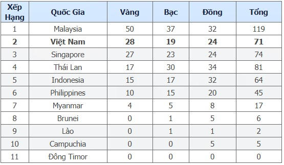 Bảng tổng sắp huy chương của đoàn thể thao Việt Nam tính đến 9h00 ngày 24/8: