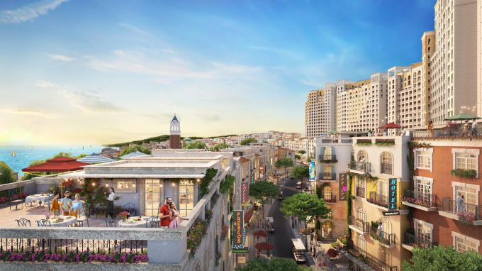 Ngay sát bờ đại dương xanh thẳm là Sun Premier Village Primavera với tổ hợp shophouse mặt biển, tổ hợp thương mại – giải trí Central Village, tháp đồng hồ cao 75m… Những dãy shophouse ôm trọn mặt biển được nhuốm màu thời gian nhờ công nghệ theming giả cổ biến mỗi căn nhà, góc phố trở thành một tác phẩm nghệ thuật độc đáo, kể những câu chuyện văn hóa, lịch sử lâu đời. Tất cả đều được thổi hồn bởi phong cách kiến trúc đặc trưng của vùng biển đầy nắng Địa Trung Hải.
