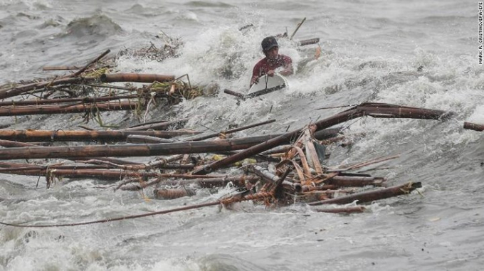 Cơ quan cứu trợ Philippines cảnh báo, hàng triệu người có nguy cơ bị ngập lụt và lở đất. 3 trường hợp thiệt mạng đầu tiên do bão Mangkhut tại Philippines đã được xác nhận. Ảnh: Một người đàn ông bị sóng đánh khi đang cố thu nhặt một số vật liệu trôi ngoài biển ở Manila.