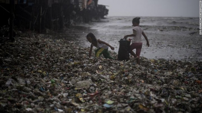 Vài đứa trẻ đang nhặt rác ở khu vực ven biển ở Manila.