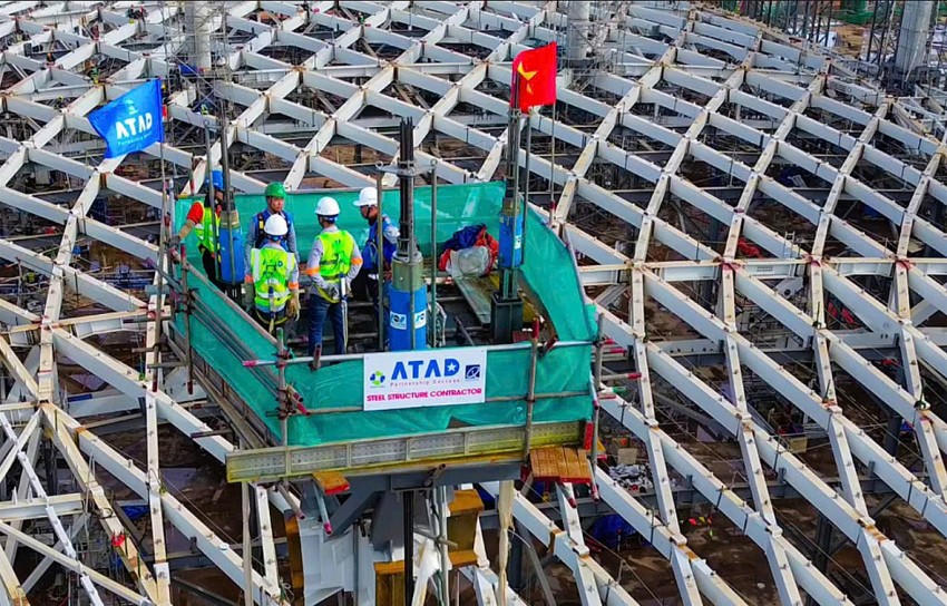 Phần mái vòm trung tâm được xem là một trong những kết cấu thép khó thi công nhất cả nước đã được nâng thành công, tạo nên dáng vóc ban đầu cho nhà ga quy mô hàng đầu Đông Nam Á.