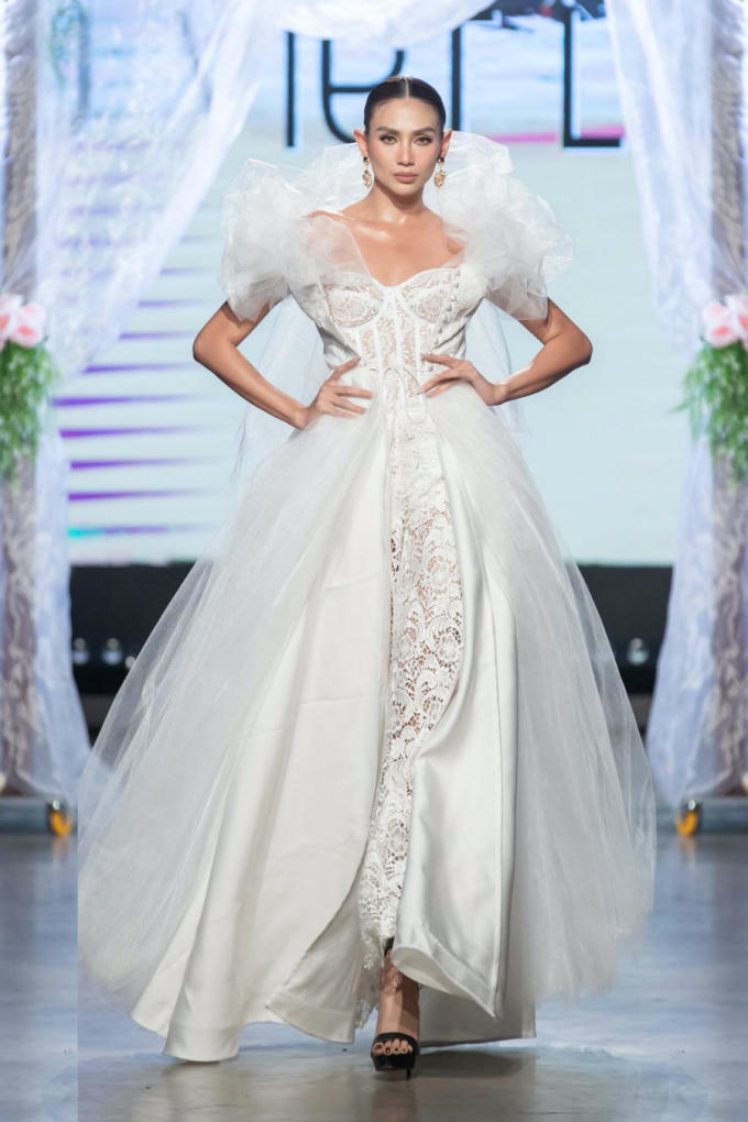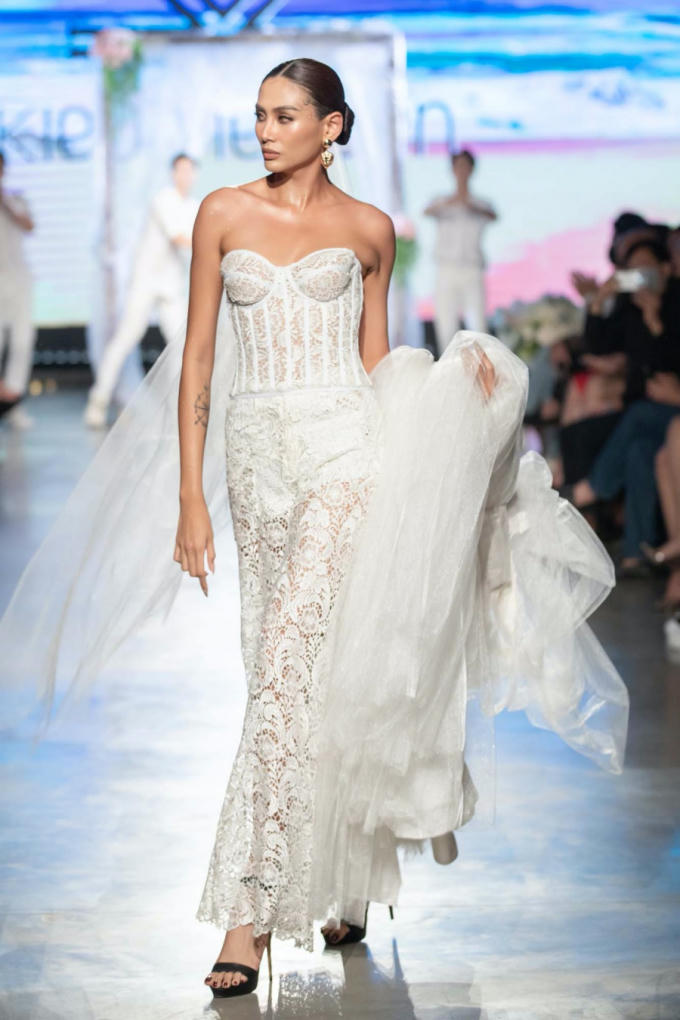 Siêu mẫu Võ Hoàng Yến kết thúc show diễn bằng một chiếc "váy" cưới cắt lazer cách điệu từ jumpsuit, vừa nữ tính nhưng cũng đầy nữ quyền.