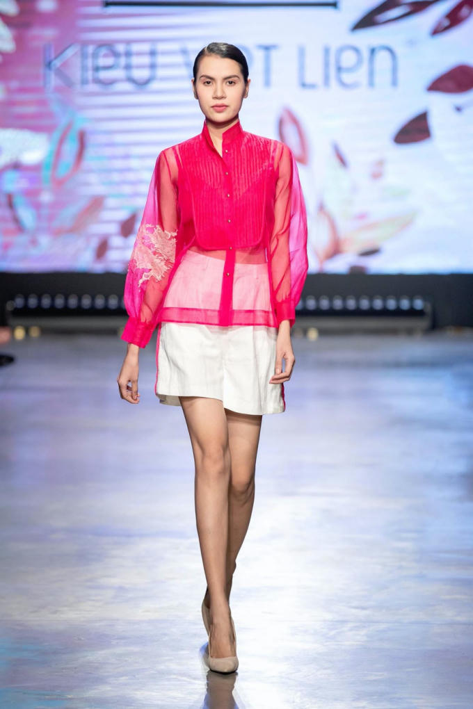 Màu đỏ bất chợt xuất hiện ở đoạn giữa bộ sưu tập cho thấy những cảm xúc, rung động đầu đời của người con gái với tình yêu. Những thiết kế dáng vest, sơ mi cách điệu xuất hiện nhiều hơn, cùng chất liệu xếp ly và ren.