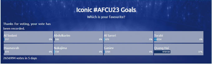 Trong thời gian đầu đăng tải, bàn thắng nhận được nhiều bình chọn nhất là quả sút phạt thành bàn của Mahdi Torabi (Iran) vào lưới U23 Trung Quốc năm 2016. Tuy nhiên, đến sáng 17-12 thì vị trí này đã thuộc về Quang Hải với lượt bình chọn tăng đội biến.