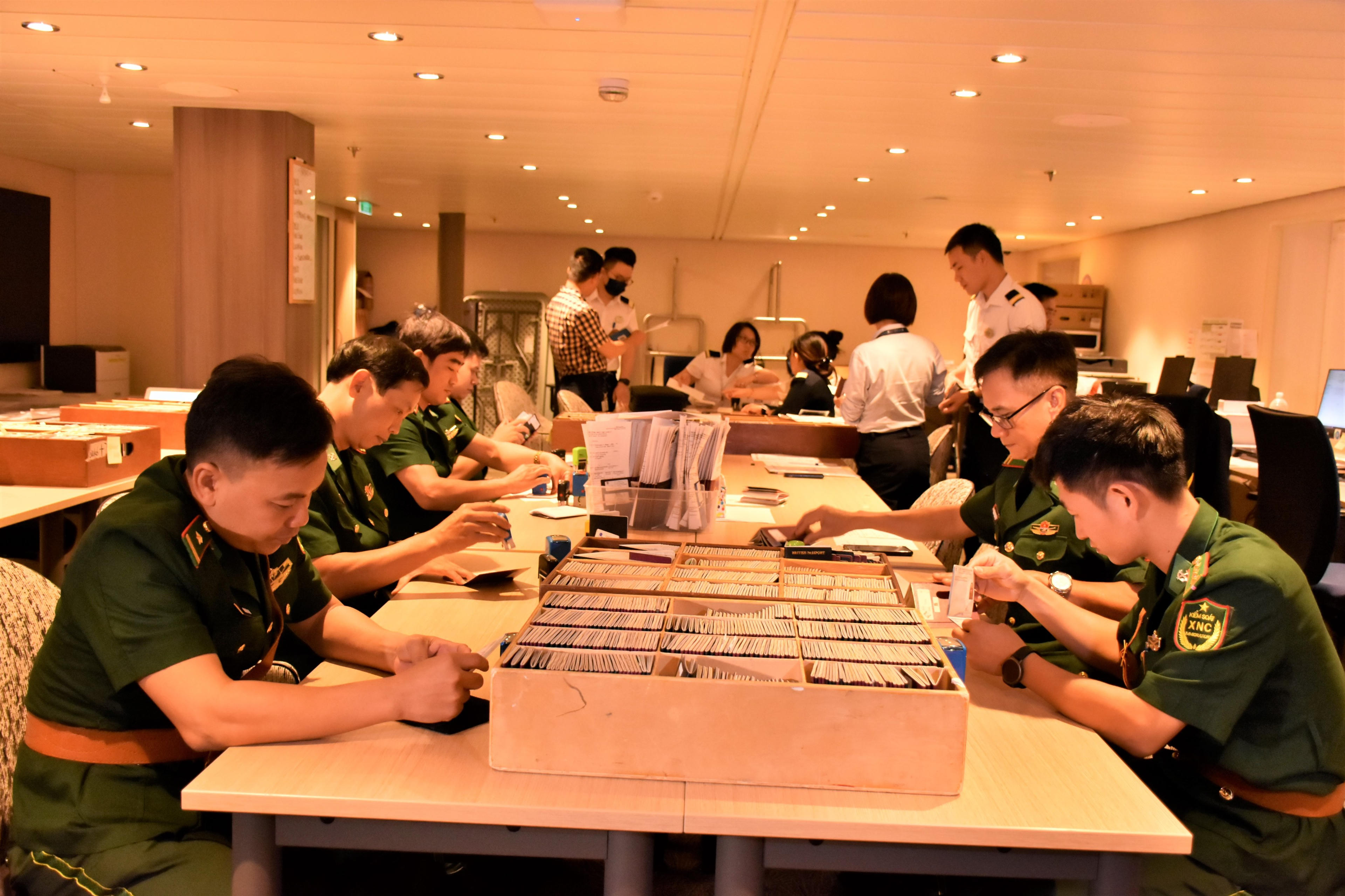 Để làm thủ tục nhập cảng nhanh chóng và chính xác cho siêu tàu, Đội Thủ tục, Ban Chỉ huy Biên phòng Cửa khẩu Cảng Bà Rịa - Vũng Tàu đã lên tàu từ phao số 0 để làm thủ tục nhập cảnh và đóng dấu thẻ đi bờ cho du khách.